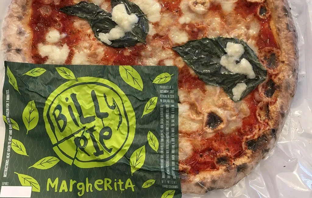 Fallen has simplified and automated much of the pizza-making process. Quality toppings have been carefully selected and imported in high volume. Their dough is sourced through Lamonica’s, a professional high-volume dough maker in New Jersey, and shipped to their production kitchen in Richmond, where it ferments for several days. Once proofed, the dough gets a gentle pat from a dough press. Pizzas are topped by hand and baked in a blazing hot, 780-degree brick oven in under two minutes. State-of-the-art digital, gas-powered, brick ovens with rotating floors expedite the process. Par-baked pizzas are transferred to cooling racks, frozen, and vacuum-packed. The staff at Billy Pie can take a dough ball to a packaged frozen pizza in less than an hour. The use of automation allows for a small staff of about 12 to make and distribute 900,000 pizzas a year. The result is a consistent, top-quality, par-baked neo-Neapolitan pizza with all the charm of a brick oven.